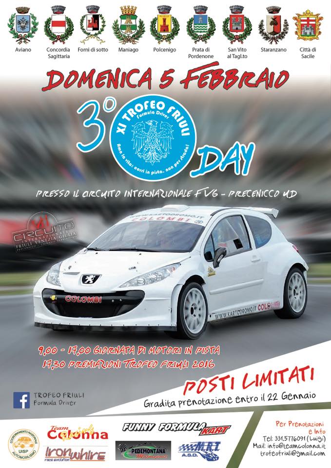 | Ciao a tutti, a grande richiesta dei piloti che hanno partecipato alla scorsa edizione, siamo felici di confermare, come anticipato a novembre, che anche per questa edizione del Trofeo Friuli ci sarà una giornata dedicata al divertimento!! Domenica 31/01/2016 presso il Circuito Internazionale di Precenicco Lignano (UD), grazie alla collaborazione tra tutte le scuderie del Trofeo Friuli, si svolgerà il 2° TROFEO FRIULI DAY.